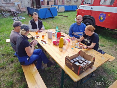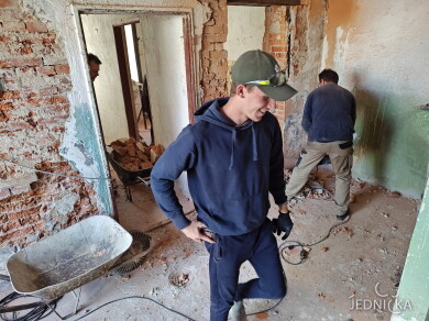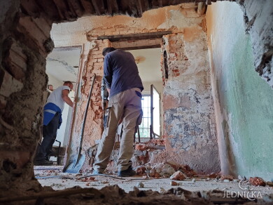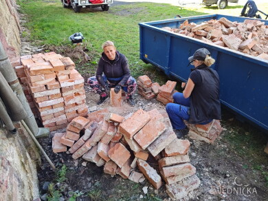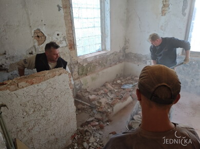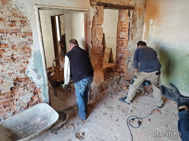 Během jedné soboty se na Jedničce vystřídalo 13 dobrovolníků. Byla to náročná, ale zároveň uspokojující práce. Vybourali jsme nepotřebné příčky a vytvořili jsme vstup na pánské WC a dokonce se nám podařilo zachránit několik desítek cihel, které nám pomohou při další výstavbě.